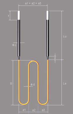 c=冷端直徑;d=熱端直徑;Le=熱端長度;Lu=冷端長度;a1+a2+a3=間距